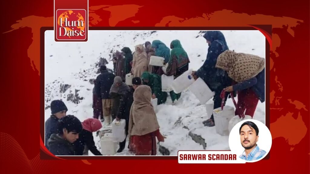 In the border village of Dansar Thang in District Kharmang, Baltistan, recent heavy snowfall has frozen the flow of daily life. The mountains are covered with a white blanket, access roads are blocked, and drinking water pipelines have frozen. In these conditions, local residents—especially women—are forced to fetch water by traveling four kilometers along dangerous, slippery mountain paths.